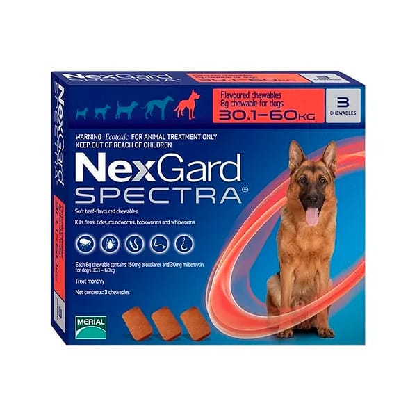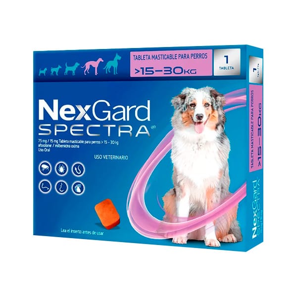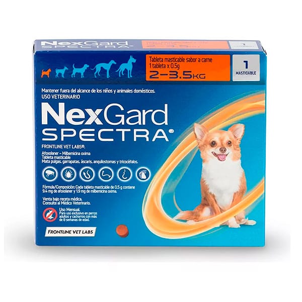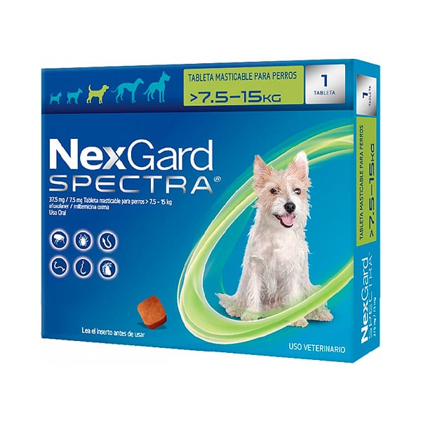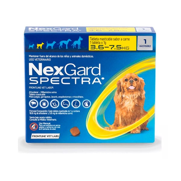 Protege a tu perro mediano (3.5 a 7.5 kg) con el antiparasitario Nexgard Spectra. Este tratamiento eficaz elimina pulgas, garrapatas y parásitos internos, asegurando una protección duradera y un bienestar constante. Ideal para perros activos que necesitan protección total. ¡Mantén a tu perro libre de parásitos con Nexgard Spectra!