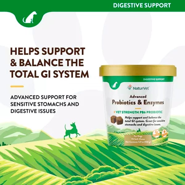 Este suplemento Advanced Probiotics & Enzymes proporciona un soporte digestivo integral para tu perro. Ayuda a equilibrar la flora intestinal y mejora la absorción de nutrientes. Perfecto para perros con digestión sensible. ¡Asegura el bienestar digestivo de tu mascota con este suplemento avanzado!