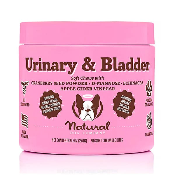 Etiquetas bienestar canino, Natural Dog Company, prevención de infecciones urinarias, salud de vejiga perro, salud urinaria perro, suplemento para salud renal, suplemento para vejiga y orina perros